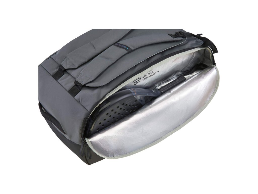 Taška nabízí přihrádku na rakety s technologií CCT+, která chrání vybavení před extrémními teplotami. Organizace je maximálně jednoduchá díky několika kapsám a praktickým řešením – od velkých vnějších přihrádek na obou stranách, přes kapsy na příslušenství, až po odnímatelnou tašku na zpocené oblečení, kterou lze snadno vyjmout a oddělit od ostatních věcí.