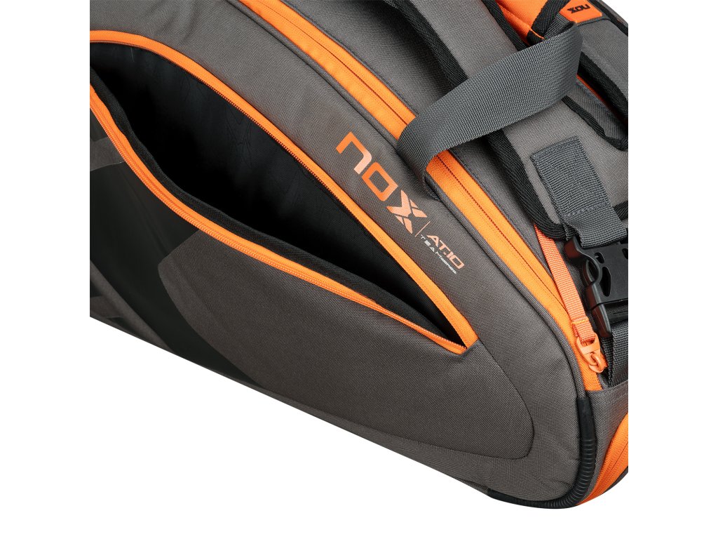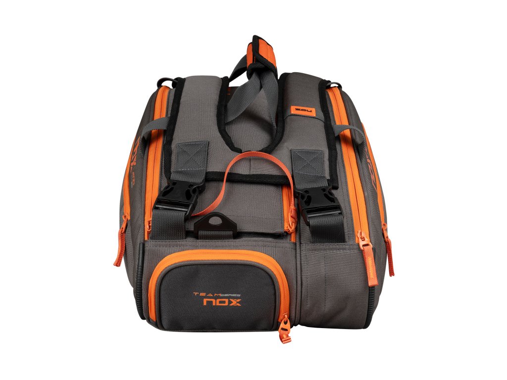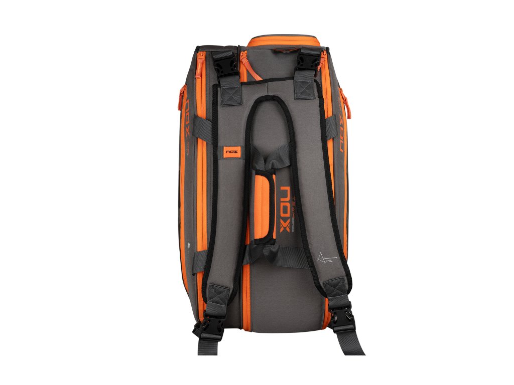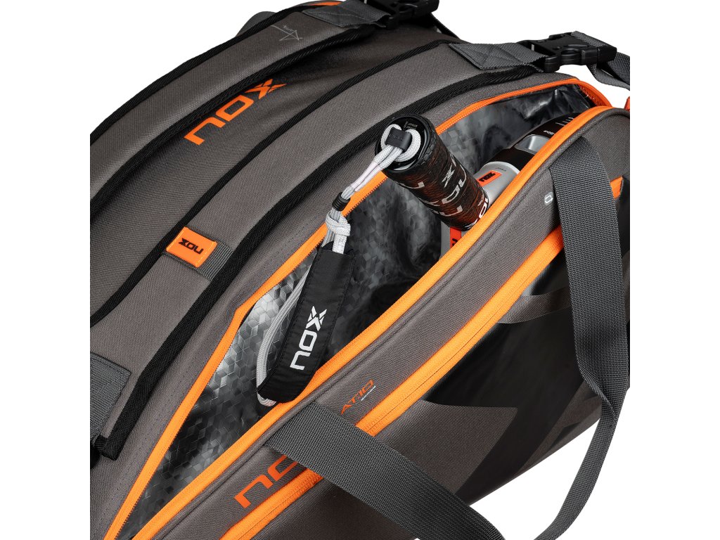 NOX TEAM AT10 v šedo-oranžovém designu, navržená pro Agustína Tapiu, nabízí ideální kombinaci prostoru, ochrany a pohodlí. S objemem 42 litrů pojme všechny vaše rakety i vybavení na tréninky a turnaje – stylově a přehledně.